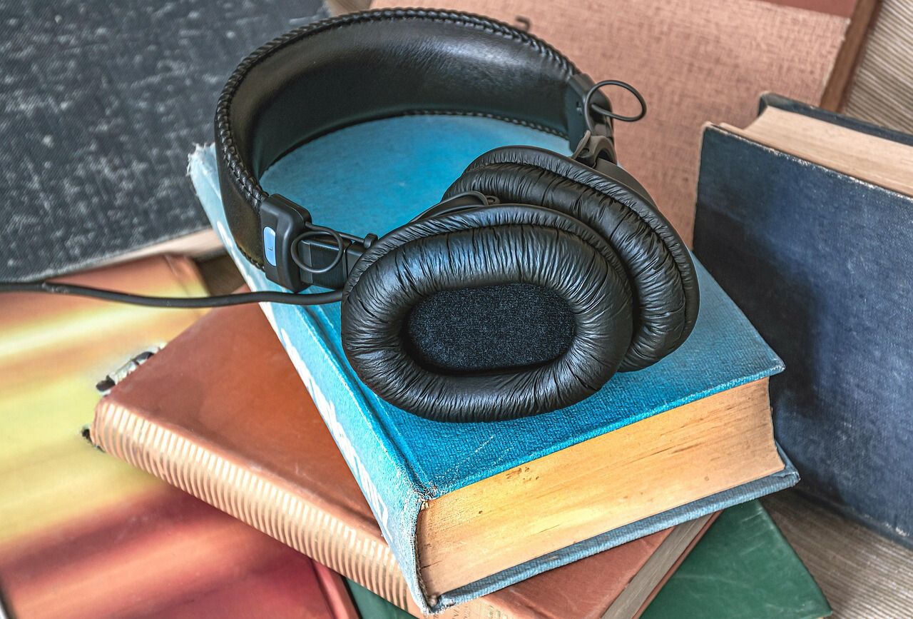 Over-ear headphones on top of a stack of books.